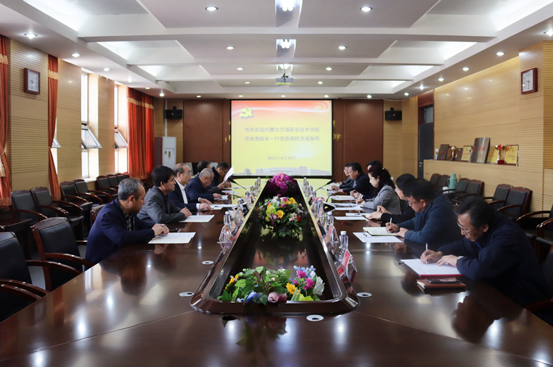 2021年4月14日上午,內(nèi)蒙古交通職業(yè)技術(shù)學(xué)院院長范體貴、副院長鄭廣軍帶領(lǐng)黨政辦公室、教務(wù)處、招生工作處、教學(xué)培訓(xùn)實(shí)習(xí)部等部門負(fù)責(zé)人來我院考察交流。學(xué)院黨委書記孫智憑會(huì)見了范體貴院長一行。學(xué)院黨委副書記、院長白托婭,副院長孫恒及相關(guān)職能部門負(fù)責(zé)人與范體貴院長一行在A439會(huì)議室進(jìn)行了座談交流。