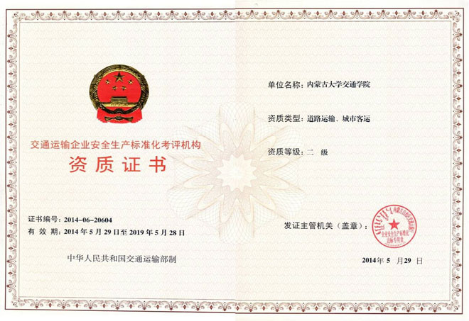 根據(jù)《內(nèi)蒙古自治區(qū)交通運(yùn)輸廳關(guān)于公布第二批交通運(yùn)輸企業(yè)安全生產(chǎn)標(biāo)準(zhǔn)化考評機(jī)構(gòu)的通知》,我院于2014年5月30日被認(rèn)定為自治區(qū)第二批交通運(yùn)輸企業(yè)安全生產(chǎn)標(biāo)準(zhǔn)化二級考評機(jī)構(gòu),承擔(dān)自治區(qū)范圍內(nèi)道路運(yùn)輸與城市客運(yùn)類企業(yè)的安全生產(chǎn)標(biāo)準(zhǔn)化建設(shè)二級達(dá)標(biāo)考評工作,資質(zhì)證書的有效期五年。目前自治區(qū)交通運(yùn)輸廳已批準(zhǔn)成立4家二級考評機(jī)構(gòu),負(fù)責(zé)對道路運(yùn)輸、城市客運(yùn)、交通運(yùn)輸工程建設(shè)等5個專業(yè)類型的企業(yè)進(jìn)行安全生產(chǎn)標(biāo)準(zhǔn)化建設(shè)達(dá)標(biāo)考評。