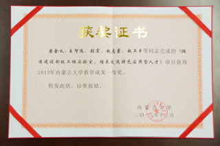 我院以柴金義院長(zhǎng)牽頭,王智遠(yuǎn)副教授、張宏副教授、趙志蒙教授與趙衛(wèi)平教授為主要參加人的《瞄準(zhǔn)建設(shè)部級(jí)工程實(shí)驗(yàn)室,培養(yǎng)交通特色應(yīng)用型人才》教學(xué)成果榮獲學(xué)校授予的校級(jí)教學(xué)成果獎(jiǎng)一等獎(jiǎng)。并在2014年9月11號(hào)內(nèi)蒙古大學(xué)召開2014年本科教學(xué)工作會(huì)議上頒發(fā)了獲獎(jiǎng)證書。